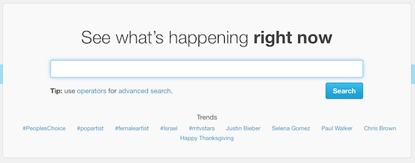 Go to search.twitter.com. Under the text box Twitter prompts you to use their ‘Operations’ or go to ‘Advanced Search’. You need to choose “Advanced Search”.